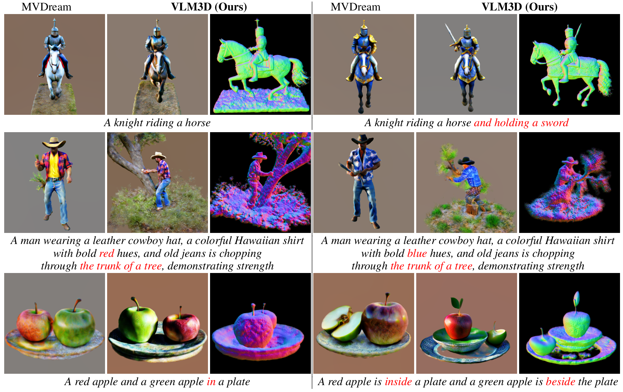 VLM3D accurately adds or removes objects (first row), changes clothing color (second row), and updates spatial relations (third row), demonstrating its better semantic understanding than baselines.